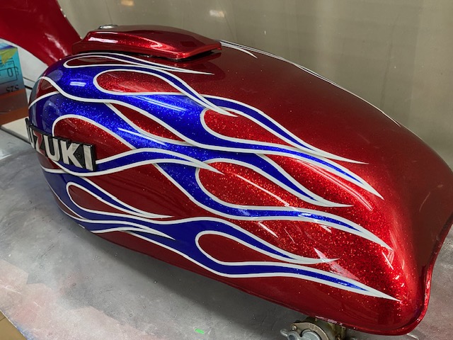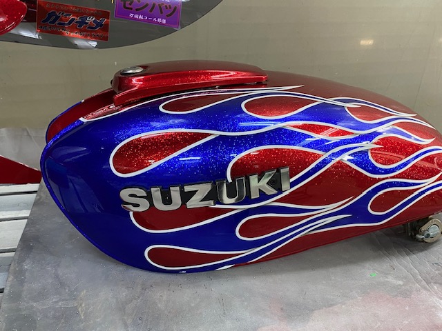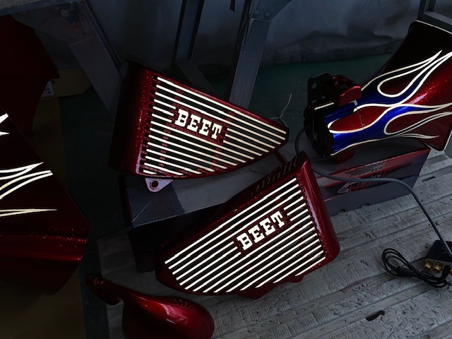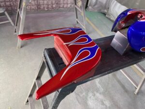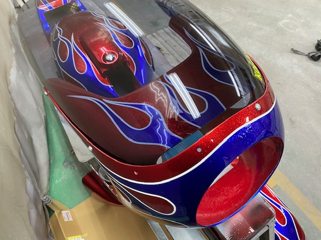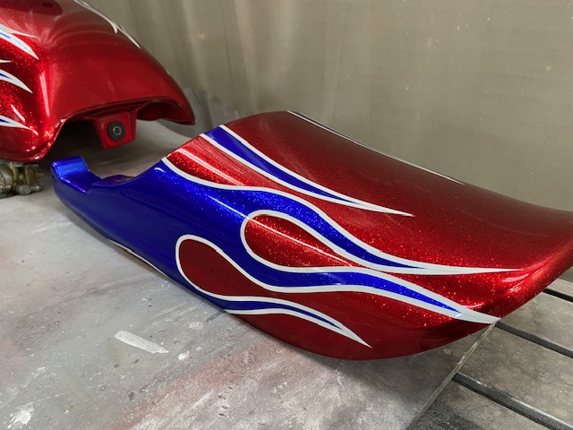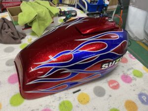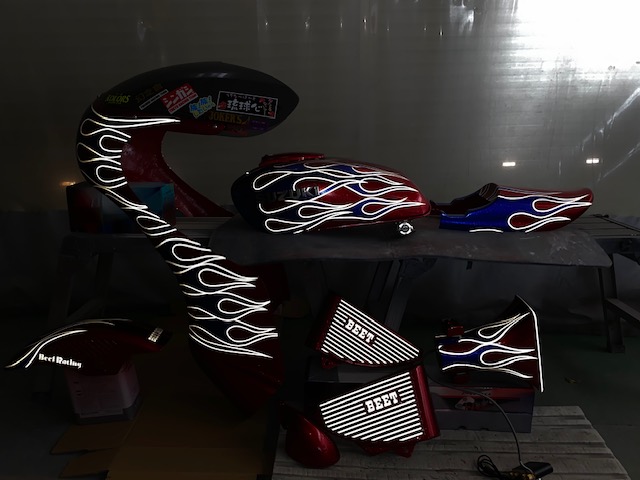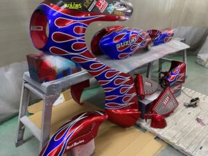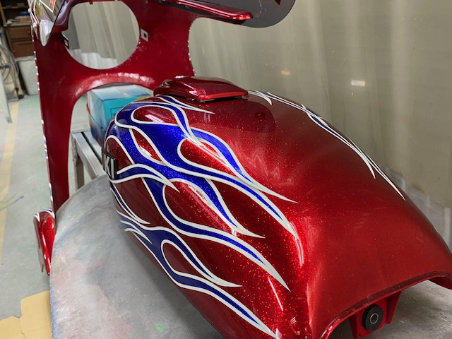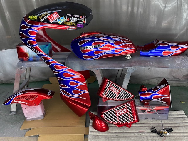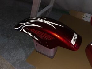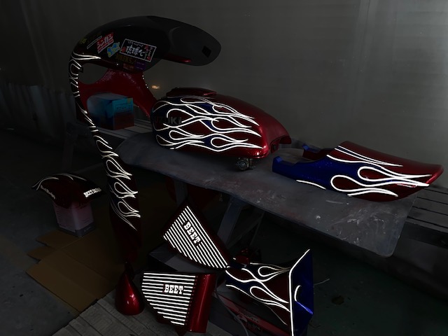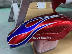 今回はバイクのフェンダーの修理をアップします。研いだりサフェーサーを吹く前に色合わせをします。色のデータがないので現物に合わせて色を作ります。削ってパテを入れても割れているところからパテも割れてしまうので、まずは割れ目が開かないように針金に熱をかけて埋め込みます。プラスチックを溶かしながら割れ目を埋めます。他の割れも同じように直します。パテで形を整えて二回目のサフェーサー吹き終わりサフェーサーを研いで塗装します。塗りあがりありがとうございました。******************〒326-0338 栃木県足利市福居町1261-1AUTO BODY SHOP MIYAMOTOTEL 0284-72-5380FAX 0284-72-5385e-mailHP営業時間 AM9時~PM5時(定休日 日曜、祝日)インスタグラムフェイスブック******************