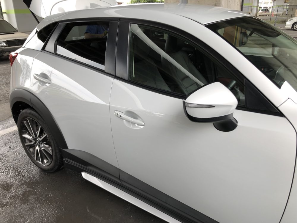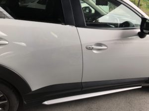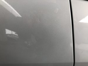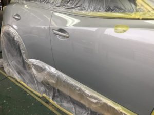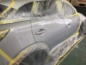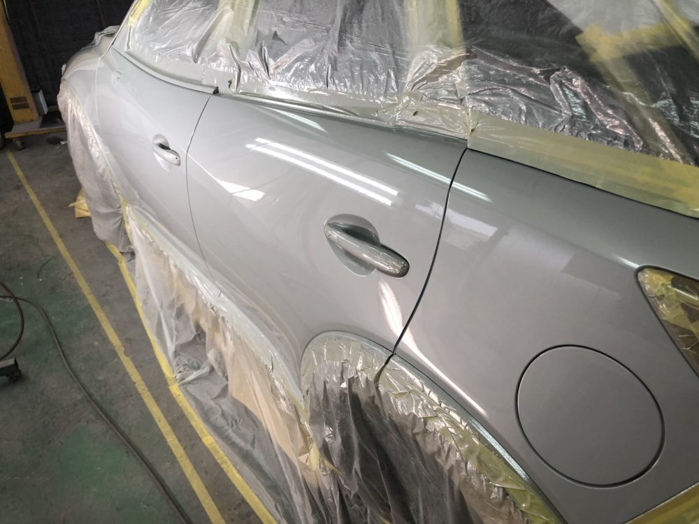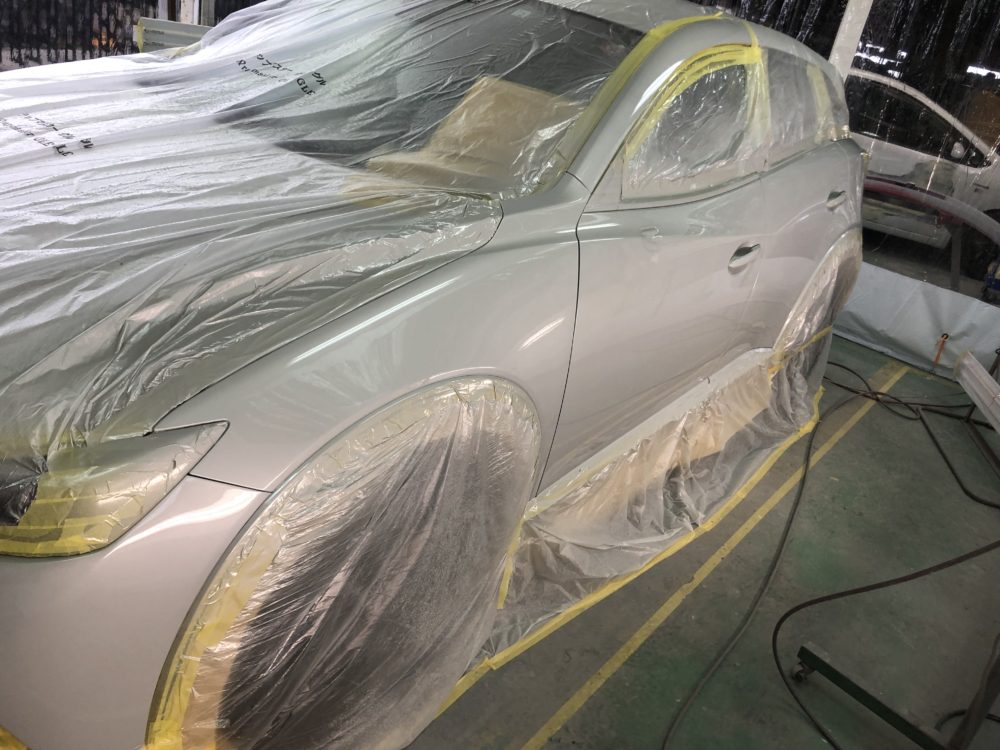 作業内容は、「他の鈑金屋さんで修理したところの修理」です🙂左側はフロントフェンダー、前後ドアが塗装してありますが色が違います😅