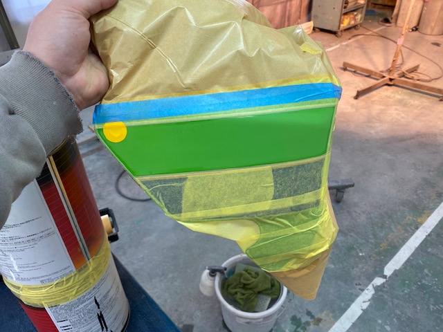 ステッカーのパールホワイトのところをカッターで切り取り、先に緑を仕上げてから