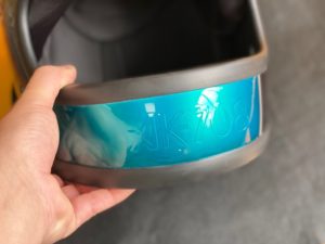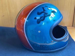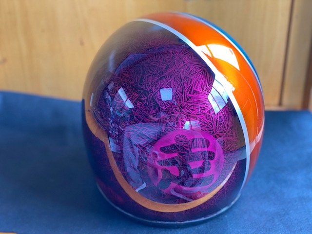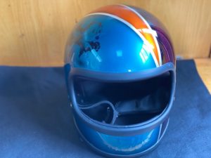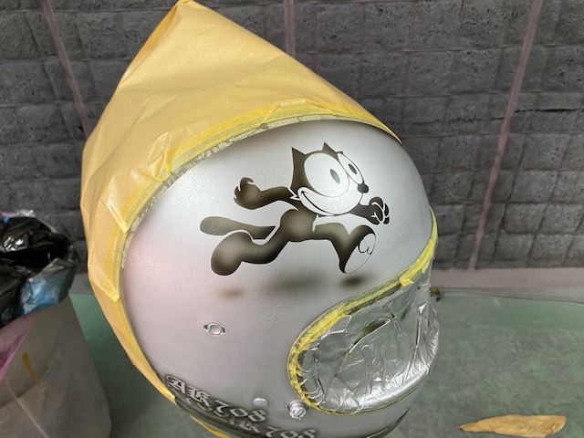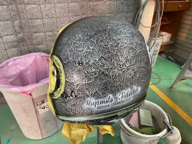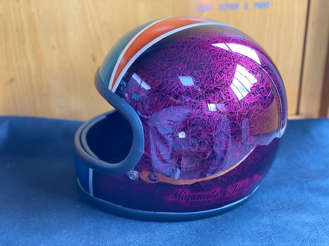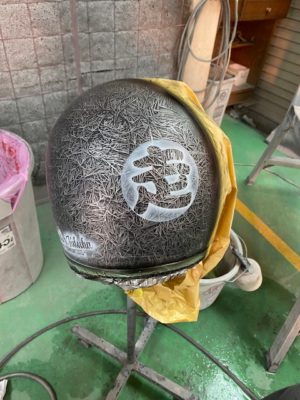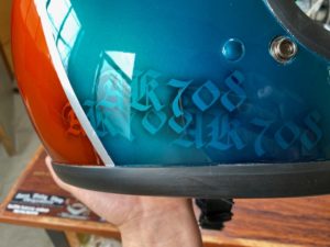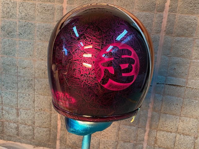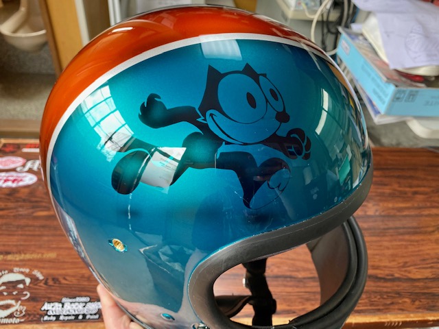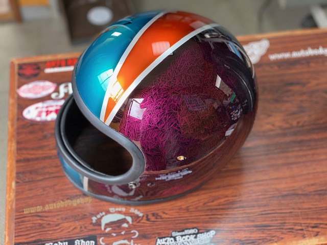 明日は定休日です☺️ よろしくお願いします😁今回まずはヘルメット塗装アップします🎶通称族ヘルです👍キャンディーカラーの塗り分けです😆わかりずらいですが紫色の部分にはベースにこの柄が入っています👍あごには3Dペイントで文字入れ😊ありがとうございました😌