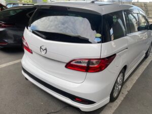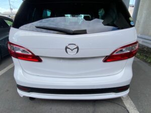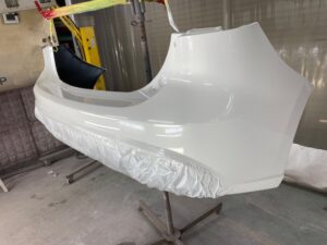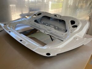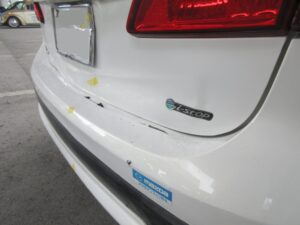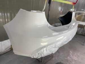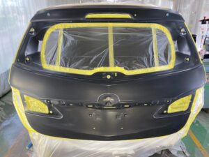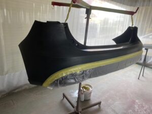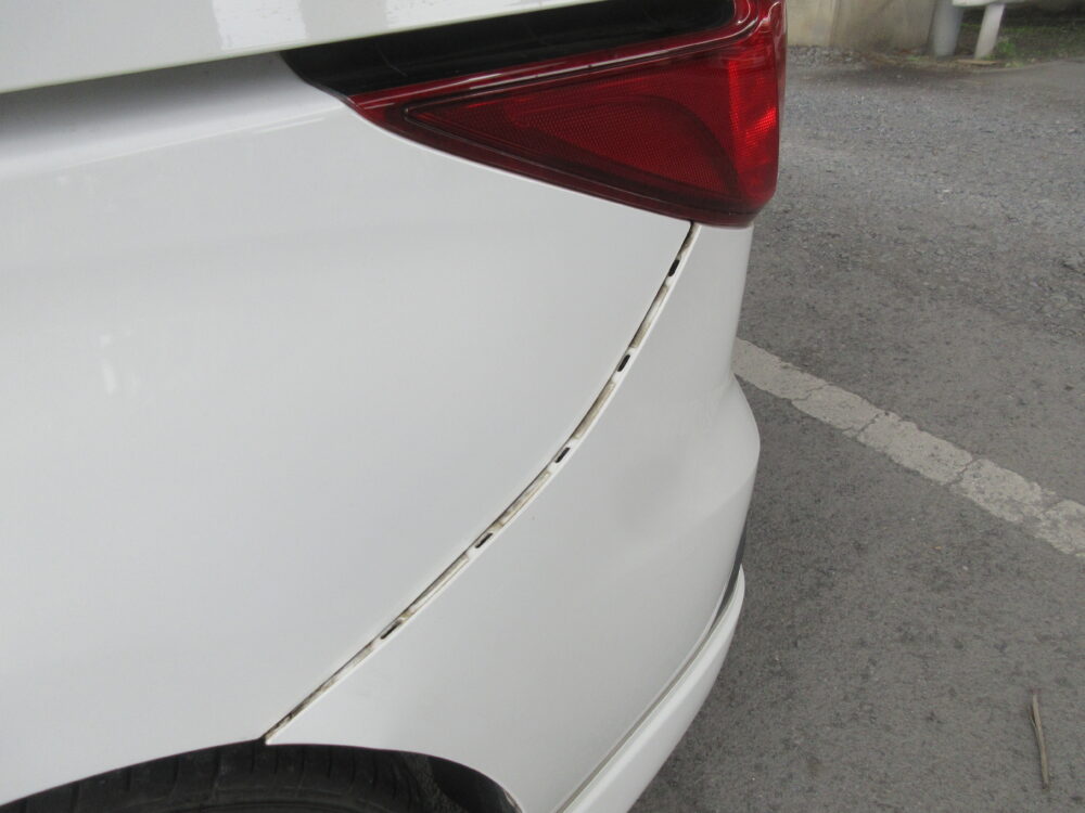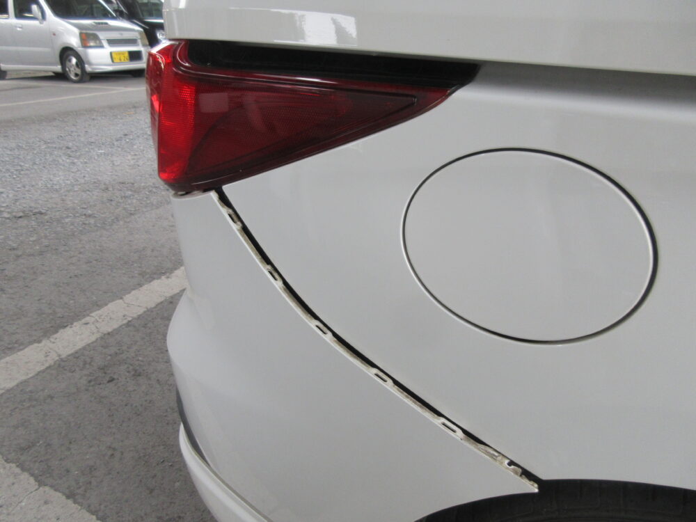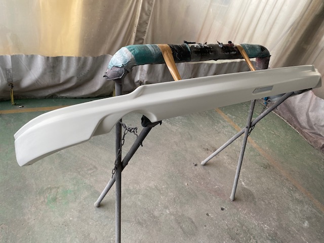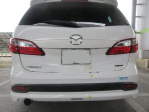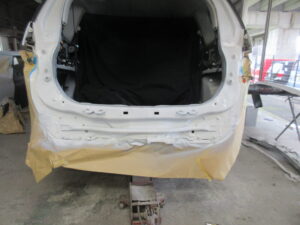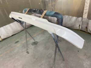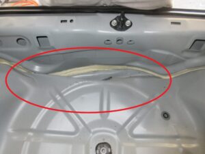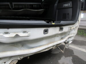 リアスポイラーは新品が手に入らないため修理します。リアバンパーを外してバンパーの中の状態です。