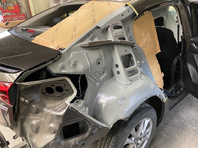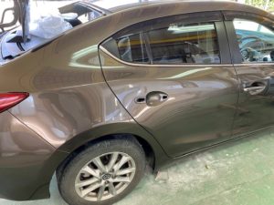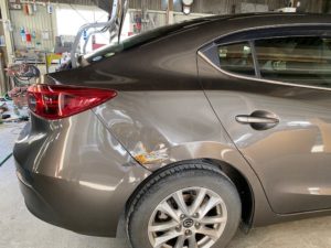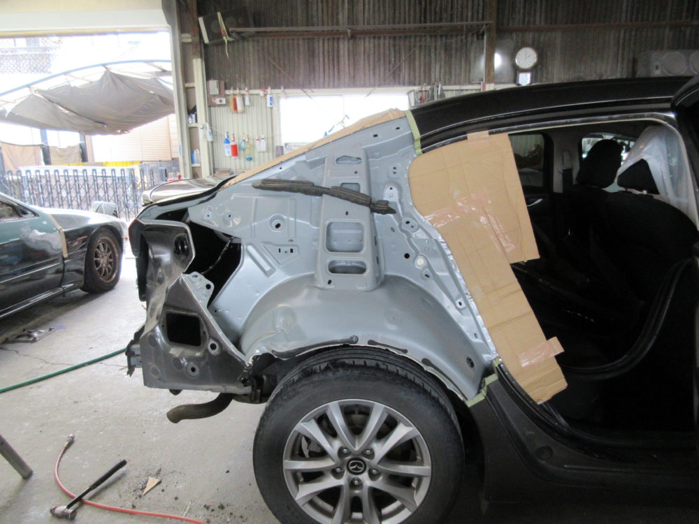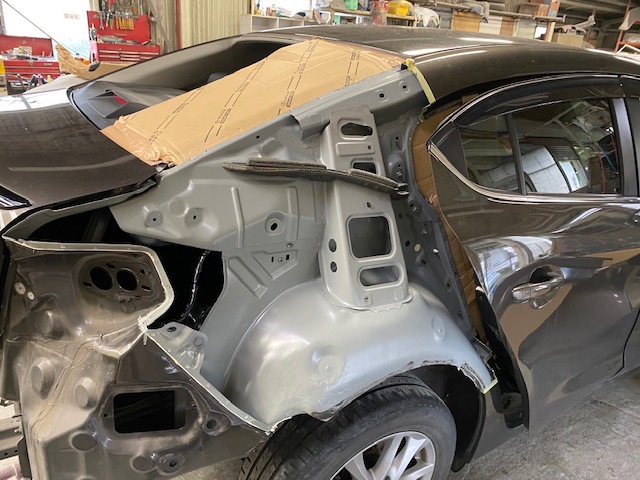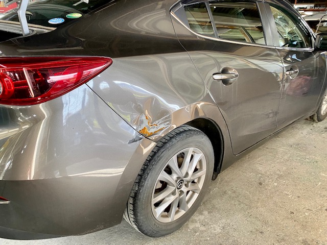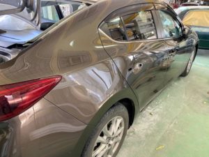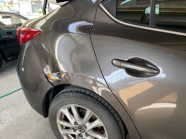 明日は定休日です🎶 9日月曜日は通常営業します😊今回はアクセラのリアクォーター、リアバンパー交換をアップします😆こちらの車両です😌リアクォーターは溶接でくっついているので、溶接を剥がして切り取ります👍新品のリアクォーターを溶接でくっつけて、つなぎ目をパテ処理してパネル全体にサフェーサー👌中外一緒に塗装するのは大変なので、先に中を仕上げます😄バンパーは未塗装新品だったのでバンパーも塗ります😉👍磨き終わりです😆今週もたくさんのお問い合わせ・ご入庫ありがとうございました🙇🏻♂️******************〒326-0338 栃木県足利市福居町1261-1AUTO BODY SHOP MIYAMOTOTEL 0284-72-5380FAX 0284-72-5385e-mailHP営業時間 AM9時~PM5時(定休日 日曜、祝日)インスタグラムフェイスブック******************