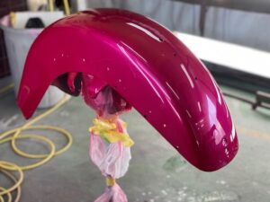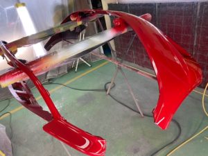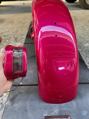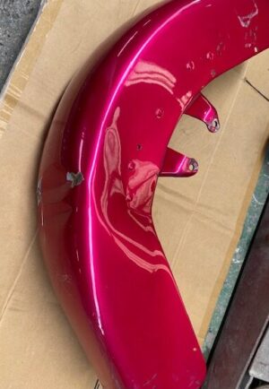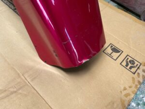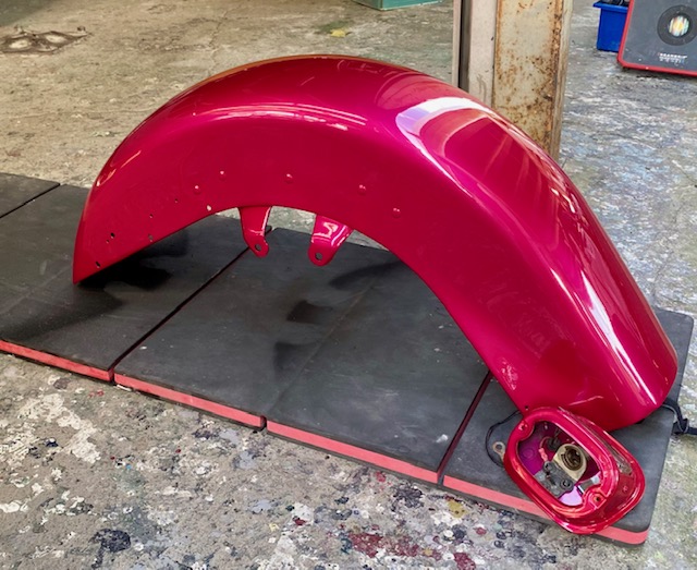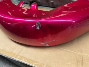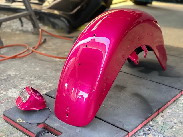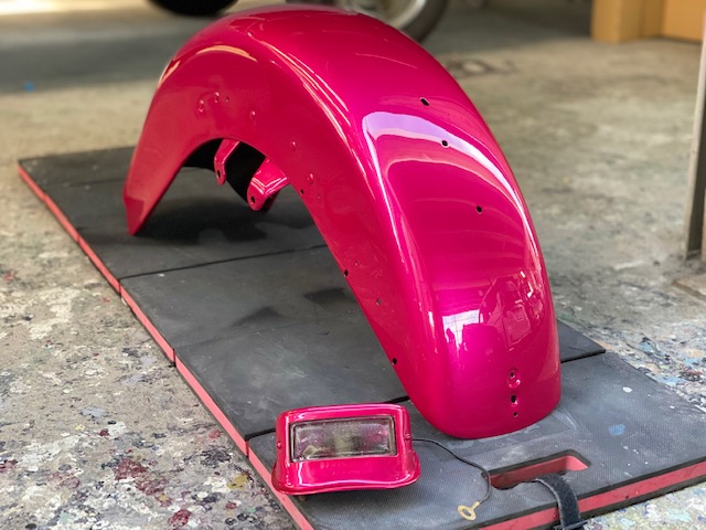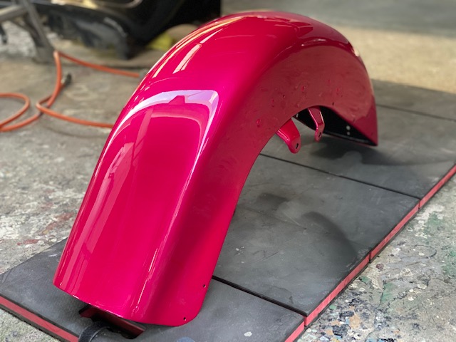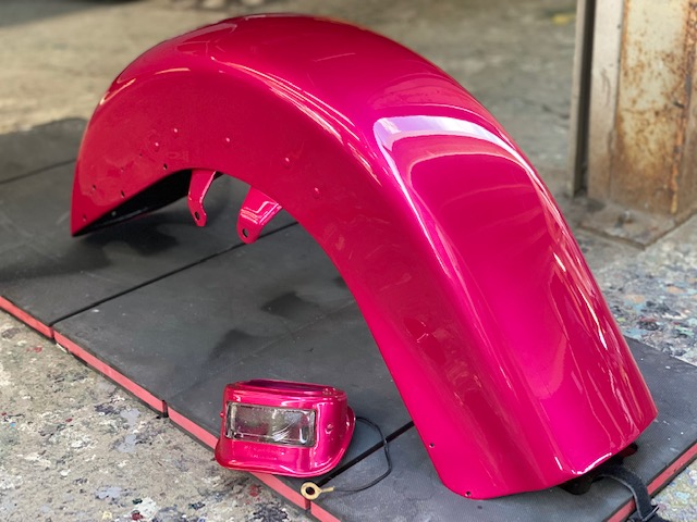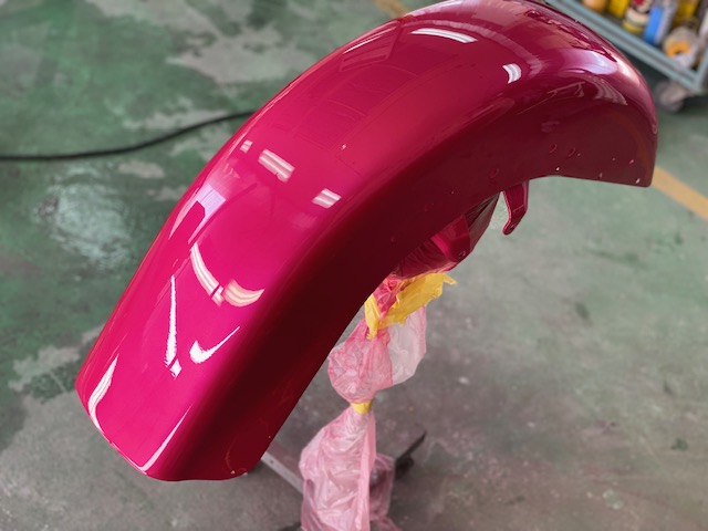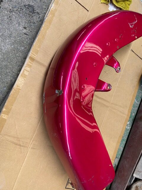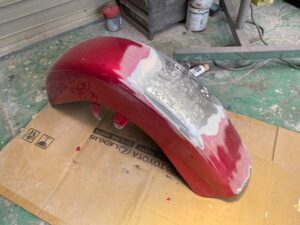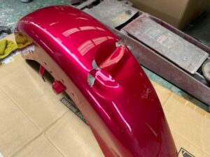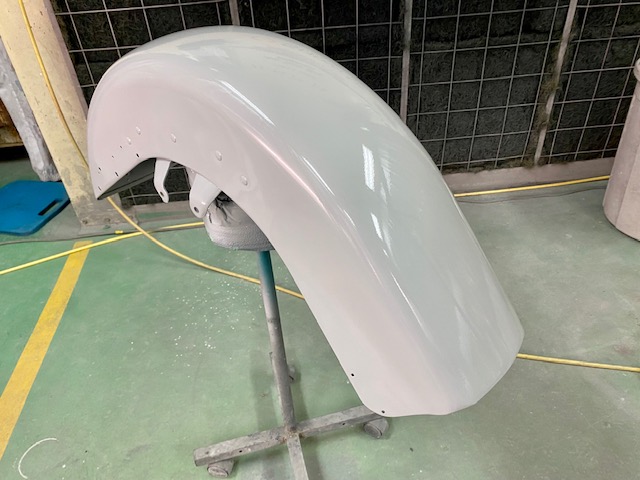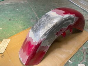明日は定休日です☺️ よろしくお願いします🙏今回はハーレーの修理をアップします🎶修理内容は凹んでしまったフロントフェンダーを直します😌ぐしゃっと折れてしまっています😅同じく側面も😔叩いて元の形に戻していきます👍形が戻ったら塗膜を削り落とし、パテを塗ります☺️写真は塗膜を削り落としたあたりです🎶工程飛びますが、パテを塗りパテを削りを何度か行い形を整えていきます😊形が整ったら全体をサンディングしてサフェーサーです😄塗装する色は数年前に他店で塗装された色なので、色の配合は全くわかりません🤣塗られている色の雰囲気を感じながら勘で色を作って現物合わせをします😄ちなみに今回の塗色はキャンディーでした👌色合わせ用にお預かりした、テールランプのパーツで色を合わせ塗装します👍裏側は元と同じように艶消し黒で仕上げます🎶完成です💯左の手に持っているパーツに色を合わせました😁凹みもばっちり直りました🎶色合いもばっちりです😆👍******************〒326-0338 栃木県足利市福居町1261-1AUTO BODY SHOP MIYAMOTOTEL 0284-72-5380FAX 0284-72-5385e-mailHP営業時間 AM9時~PM5時(定休日 日曜、祝日)インスタグラムフェイスブック****************** -
