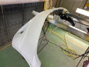 作業内容はフロントバンパー交換、右フロントフェンダー、フロントスポイラー修理です😊まずは元のバンパーをばらして、新品バンパーを仮合わせします👌