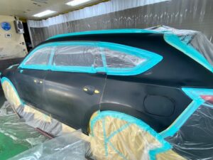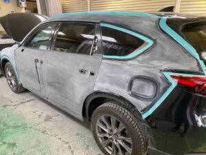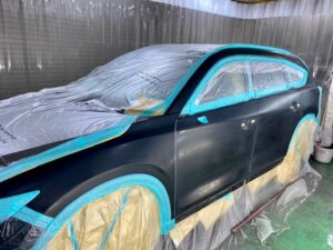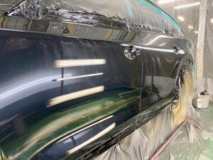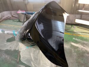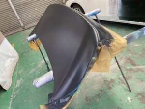 塗装をすべて剝離してから、エスコ、黒サフ、色、クリヤーの順で作業します。劣化したクリヤーを剥がしてクリヤーを再塗装します。