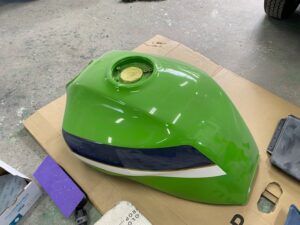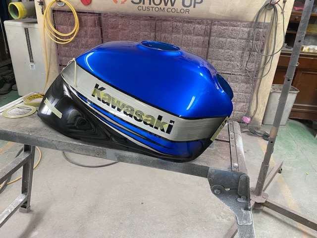 マスキングを全部剥がしてクリヤー塗装。乾いたら塗り分けの段差の研ぎ。またクリヤー塗装。乾いたら磨き前の研ぎ。磨き。