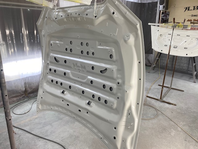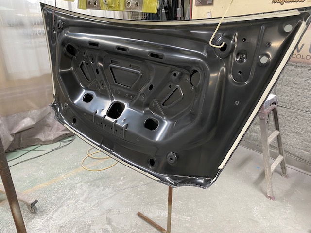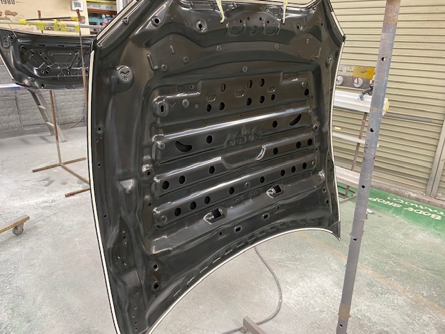 交換するボンネット、トランクの裏を塗ります。