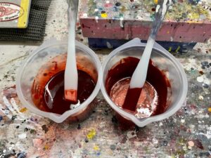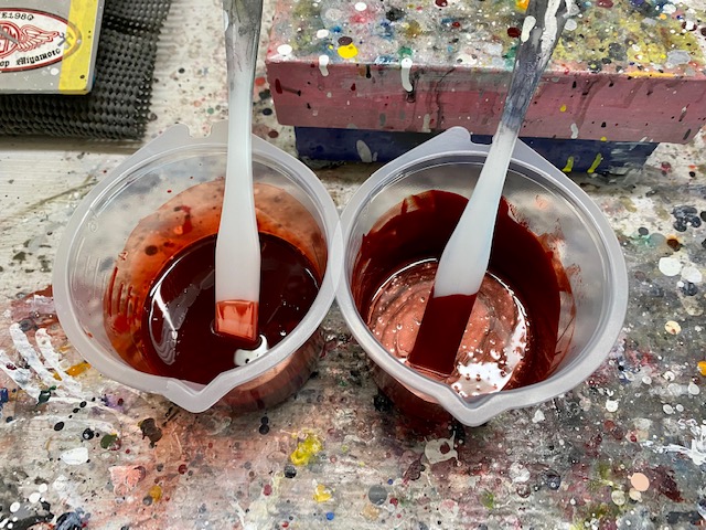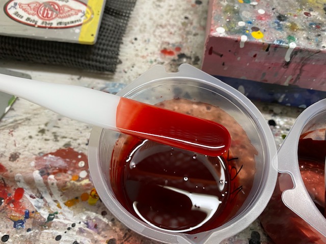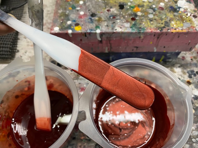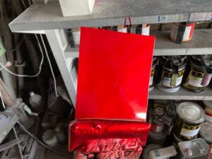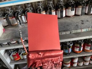 塗り板に塗った時よりカラークリヤを重ねる回数が多くなると色が赤黒く。少ないと薄くて明るい赤になってしまうので、塗り板と同じ回数塗り重ねます。
