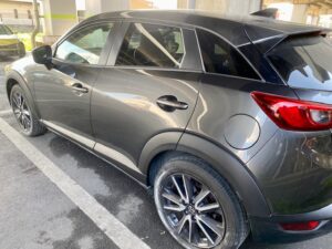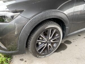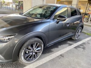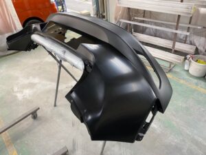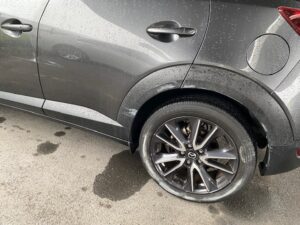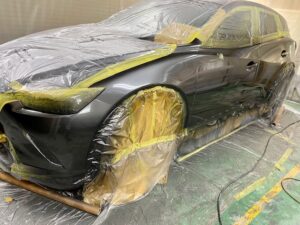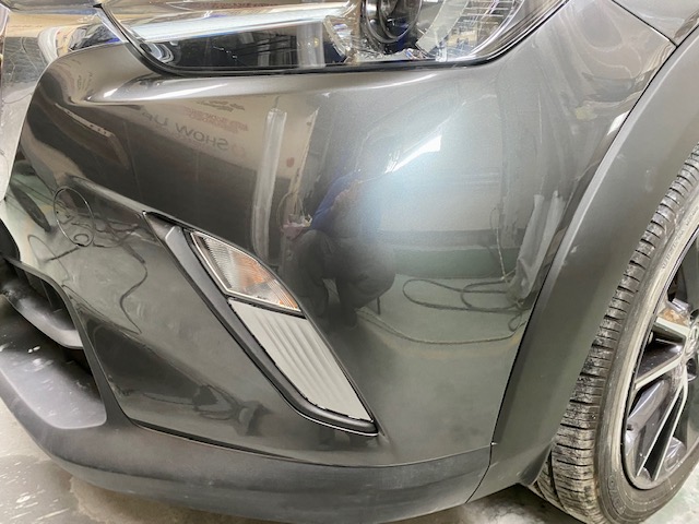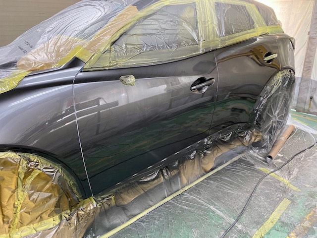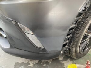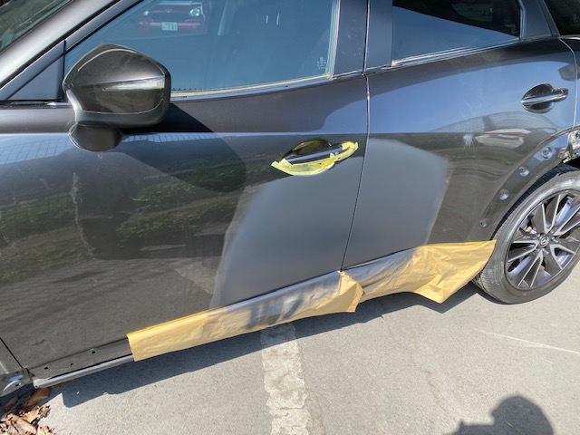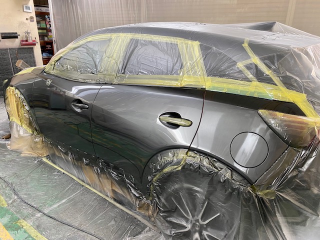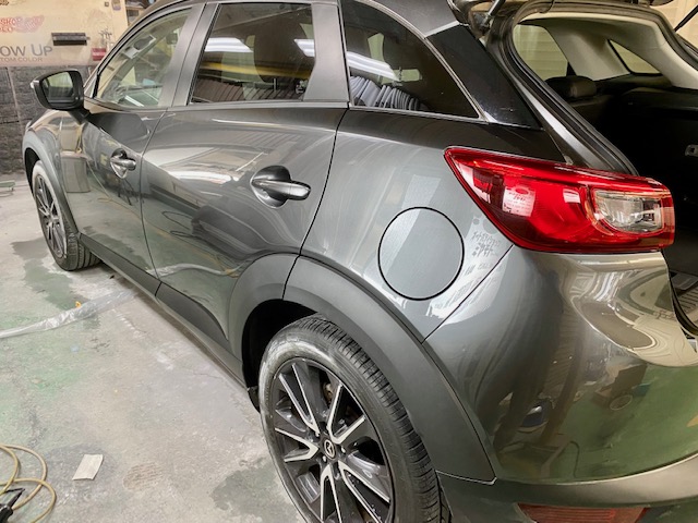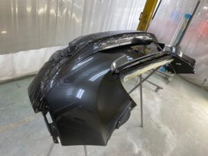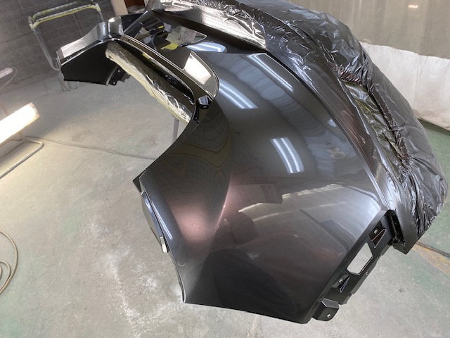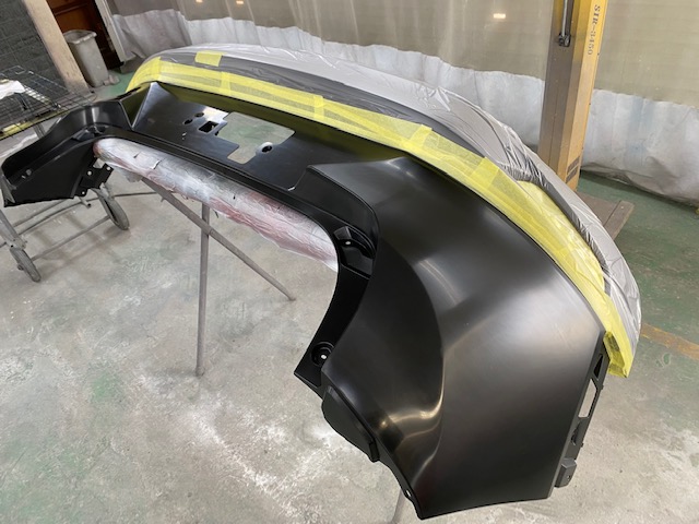 今週もありがとうございました。明日は定休日です。今回はCX-5のバンパー交換をアップします。傷はこんな感じです。修理出来ますが、ぶつけられてしまって保険修理なので交換します。ボディで色合わせをして新品バンパーを塗ります。まずは色を塗らない素地部分のマスキングからです。樹脂パーツは、プライマーを塗ってから色を塗ります。ベースカラー塗装後👉クリヤー塗装👉組んで磨いて完成です。磨きはバンパーだけでなく、ヘッドライト、フェンダーも一緒に磨いたので艶々です。ありがとうございました。 -