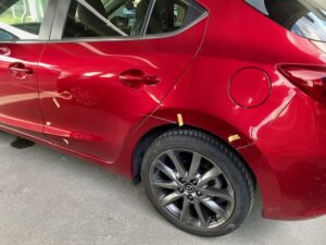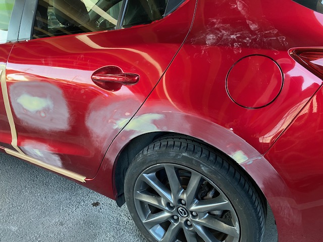 アクセラの左リアドア、クォーター、リアバンパーの修理です。