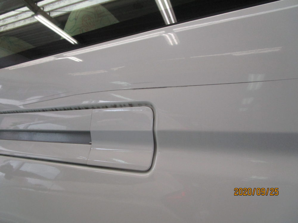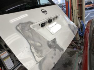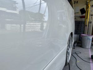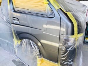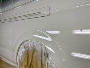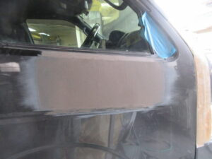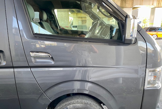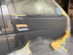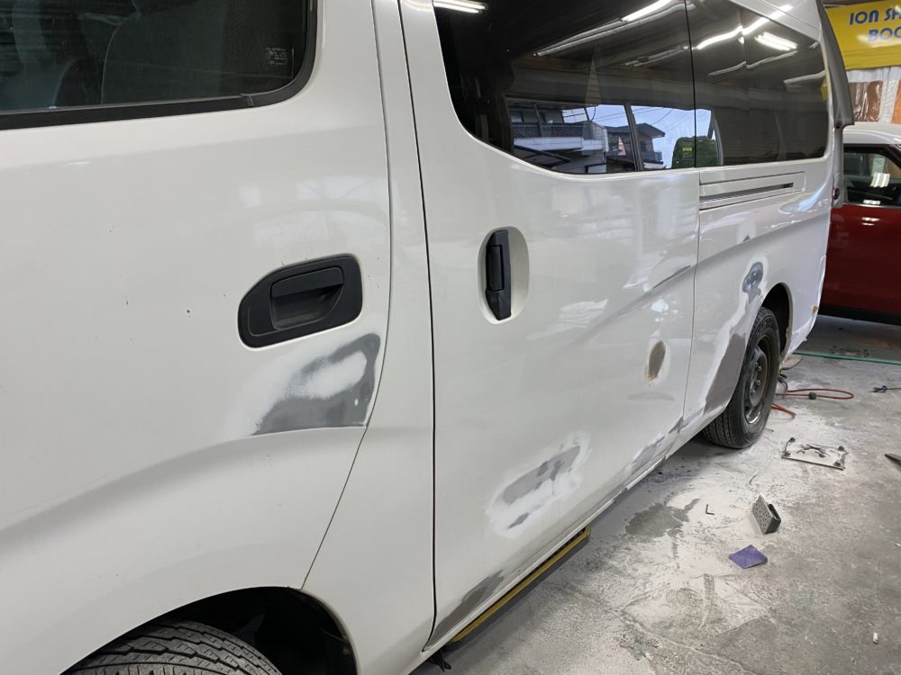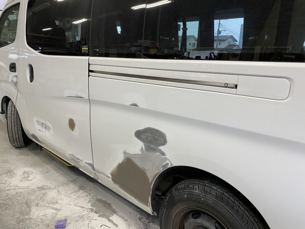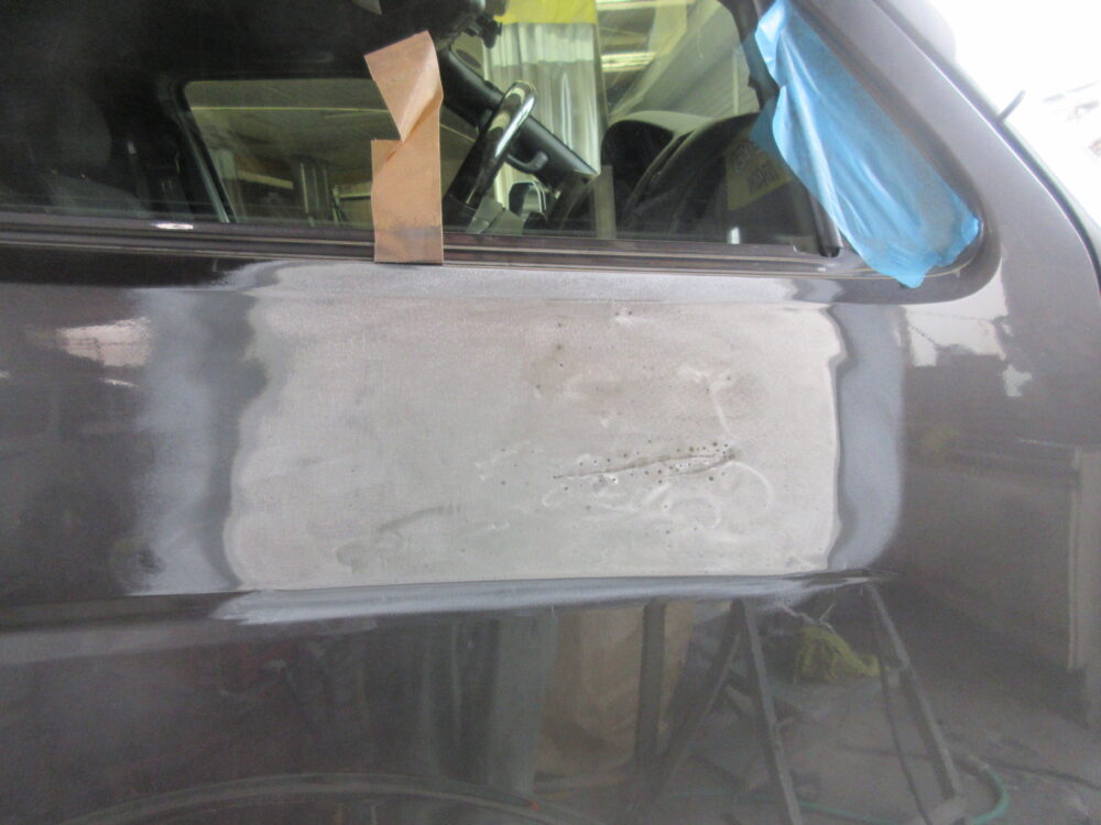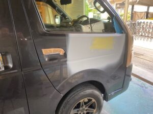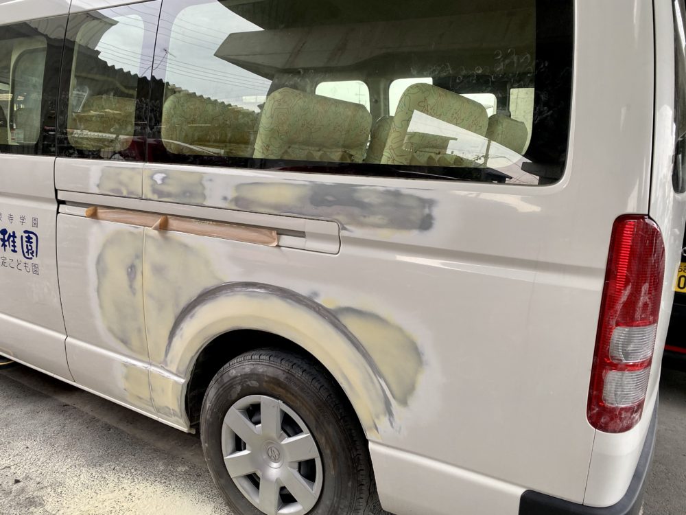 今回はハイエースの作業をアップします。右フロントドアのへこみの修理です。まず鈑金。へこんだ鉄板を戻します。サフェーサー。