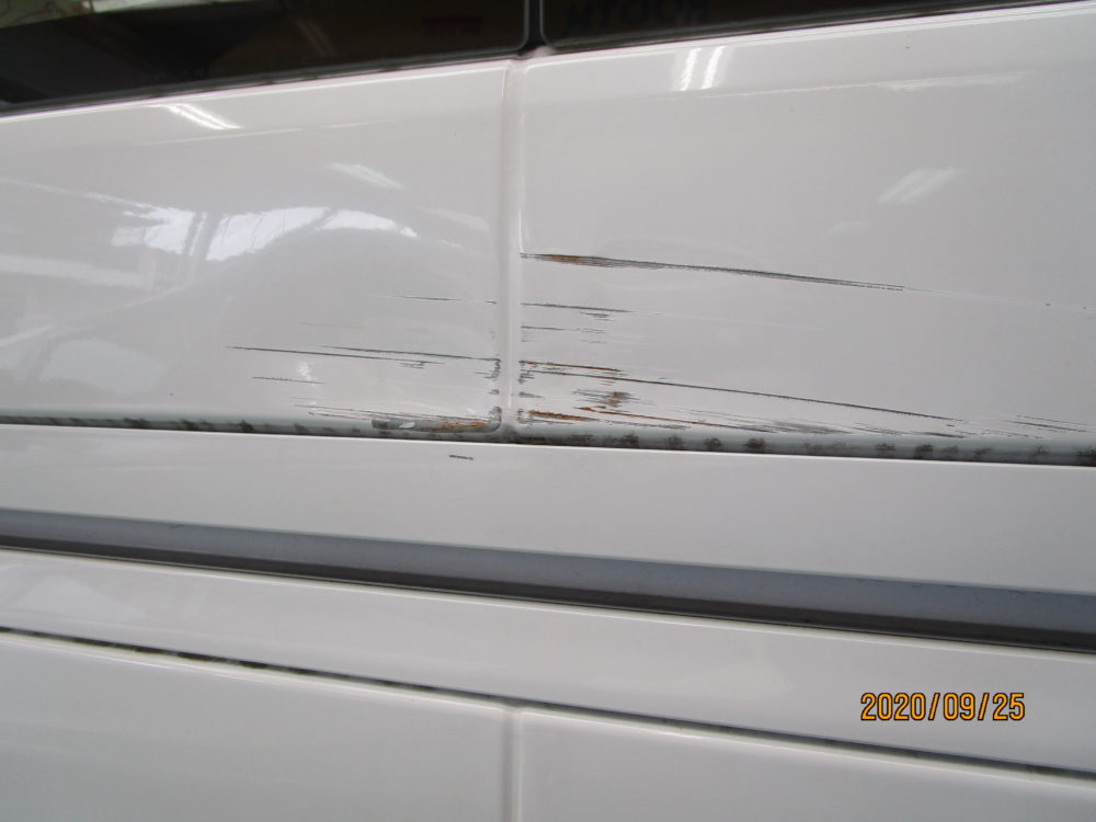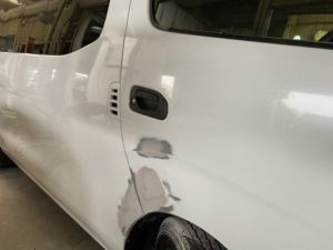 今回はハイエースの修理をアップします👍損傷はこんな感じです。スライドドアとクォーターです。写真撮り忘れでいきなり塗装前です。リアバンパーも塗ります。