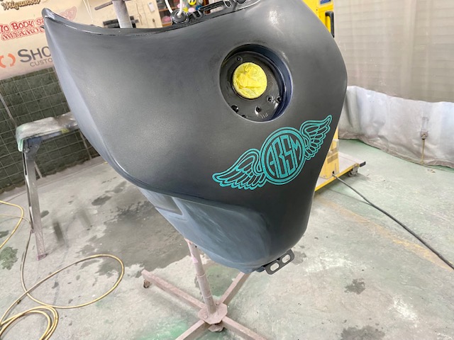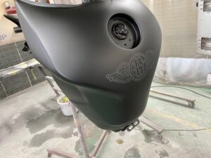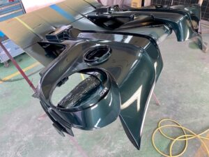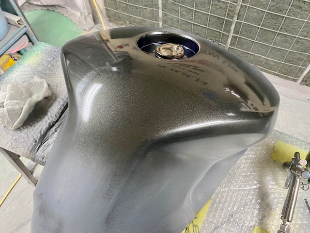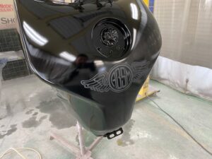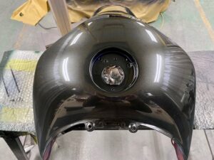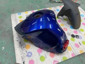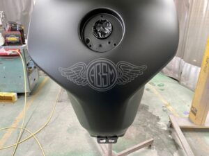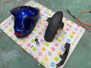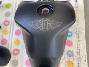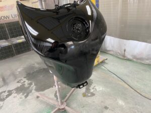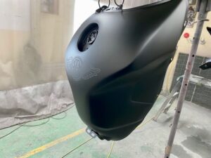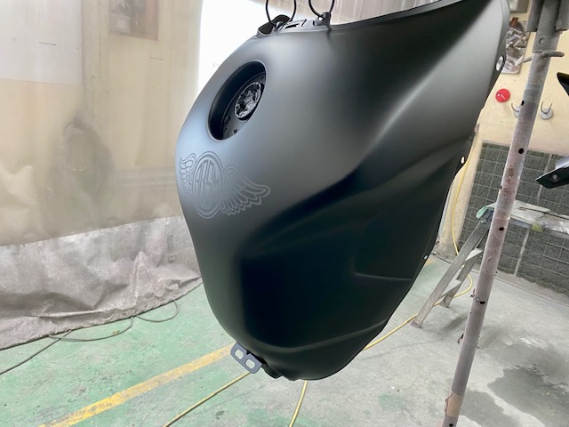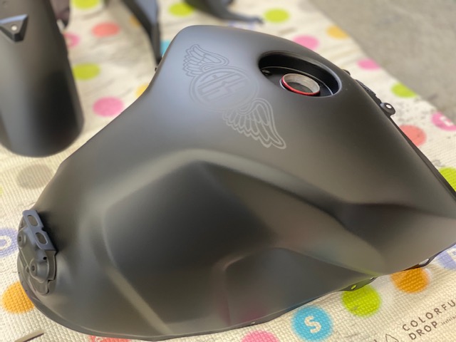 今回はオートバイをアップします。ヤマハMT09というバイクです。間違えていたらごめんなさい🤣作業内容は色変えです。まずは完成写真です。うちのロゴを大き目に入れさせて頂きました。もともとはこんな感じ。一度修理されていて、いまいちな仕上がりだったのでやり直しました。サフェーサー塗り終わり。先にロゴの黒めのガンメタを塗装。これはこれでいい感じの色です。ガンメタを塗装後全体にクリヤーを塗装します。乾燥後全体を足付けして、ロゴのマスキング。全体に黒を塗装します。ロゴのマスキングを剥がして艶消しクリヤーを塗装します。他のパーツも艶消しブラックに塗装します。裏側も👌完成です。ありがとうございました。 -