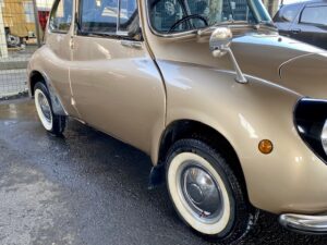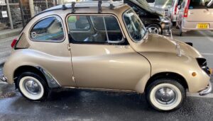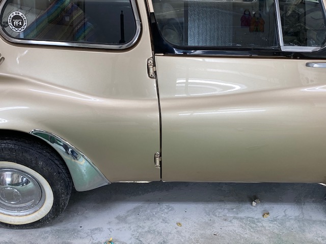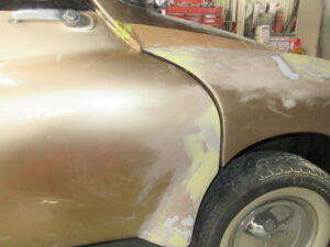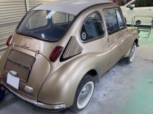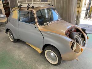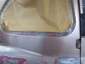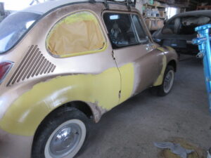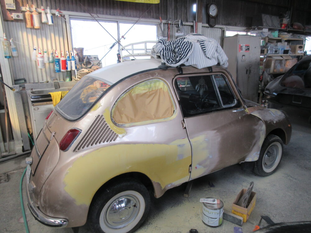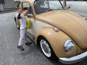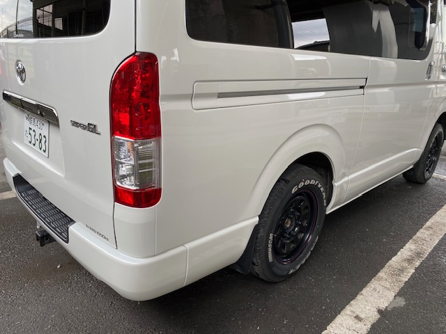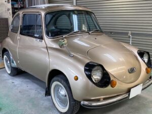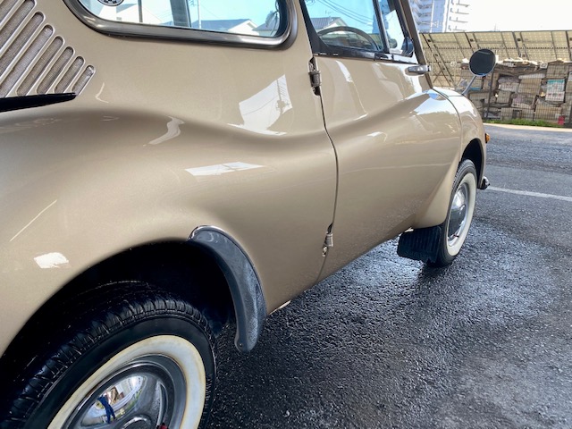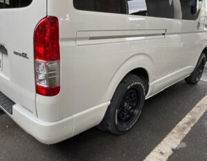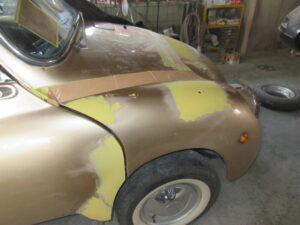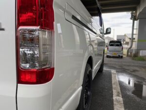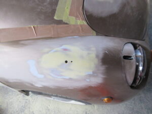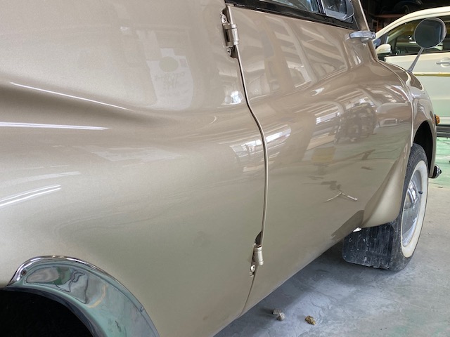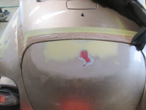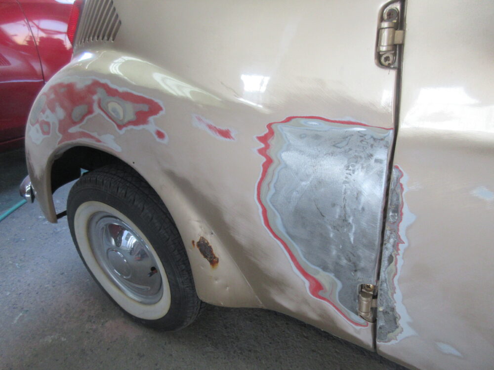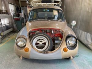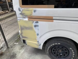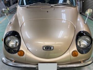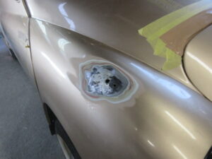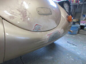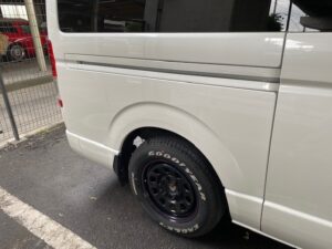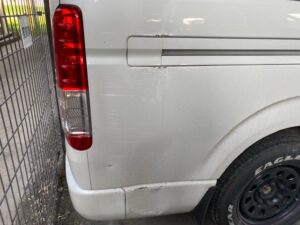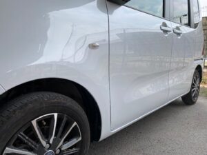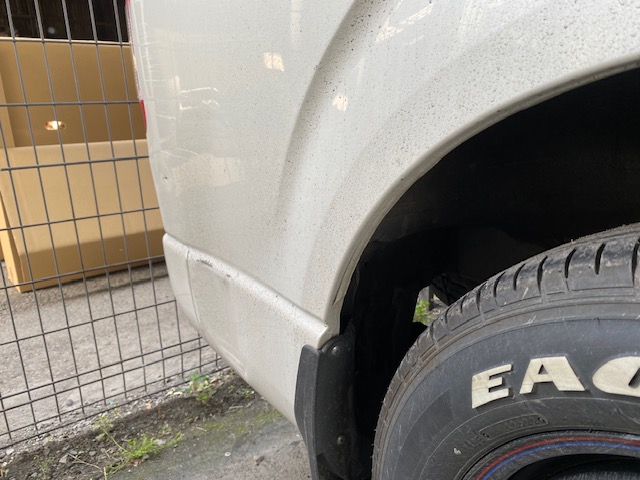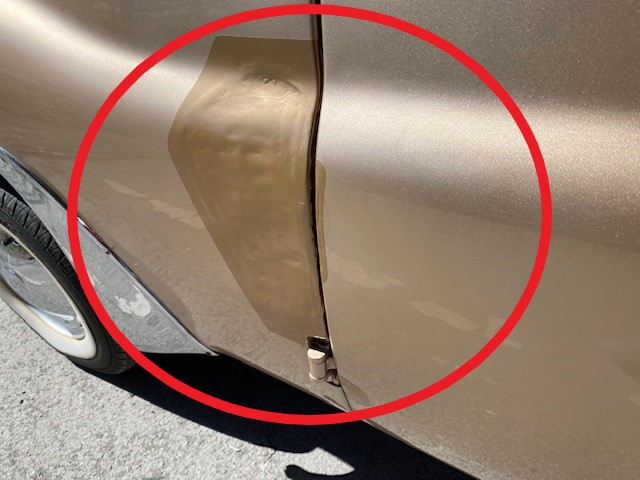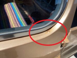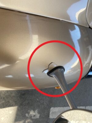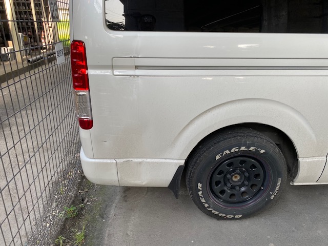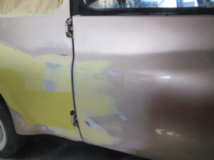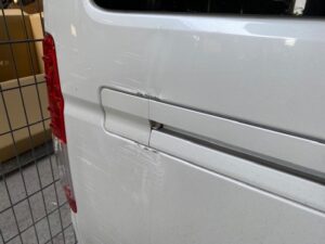 運転席ドア、フロントフードの開閉がスムーズではなかったのでそちらの調整です。走行中にドアが開いてしまったのでドアのヒンジ部分がへこんでしまいました。