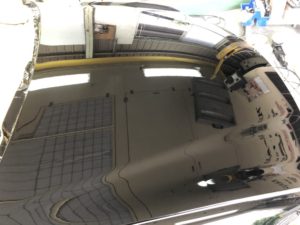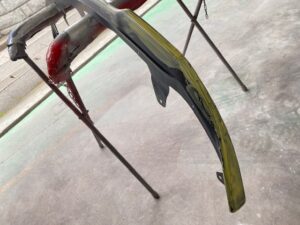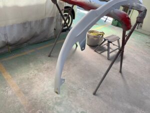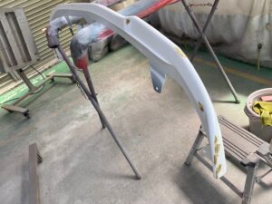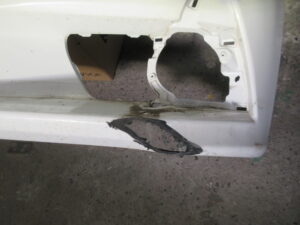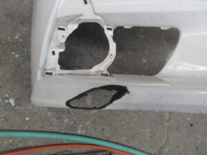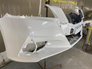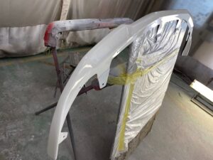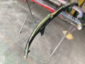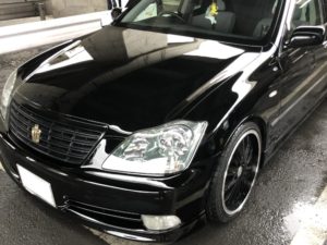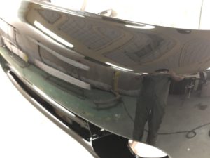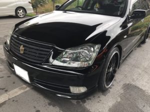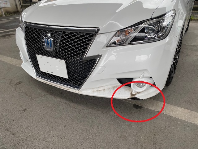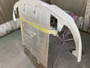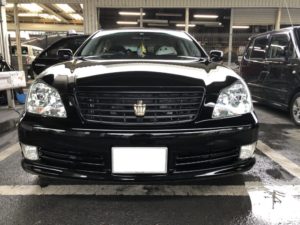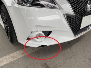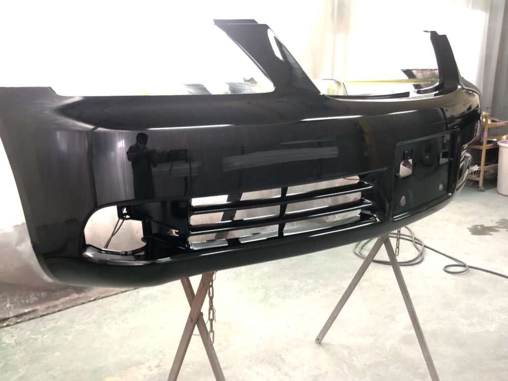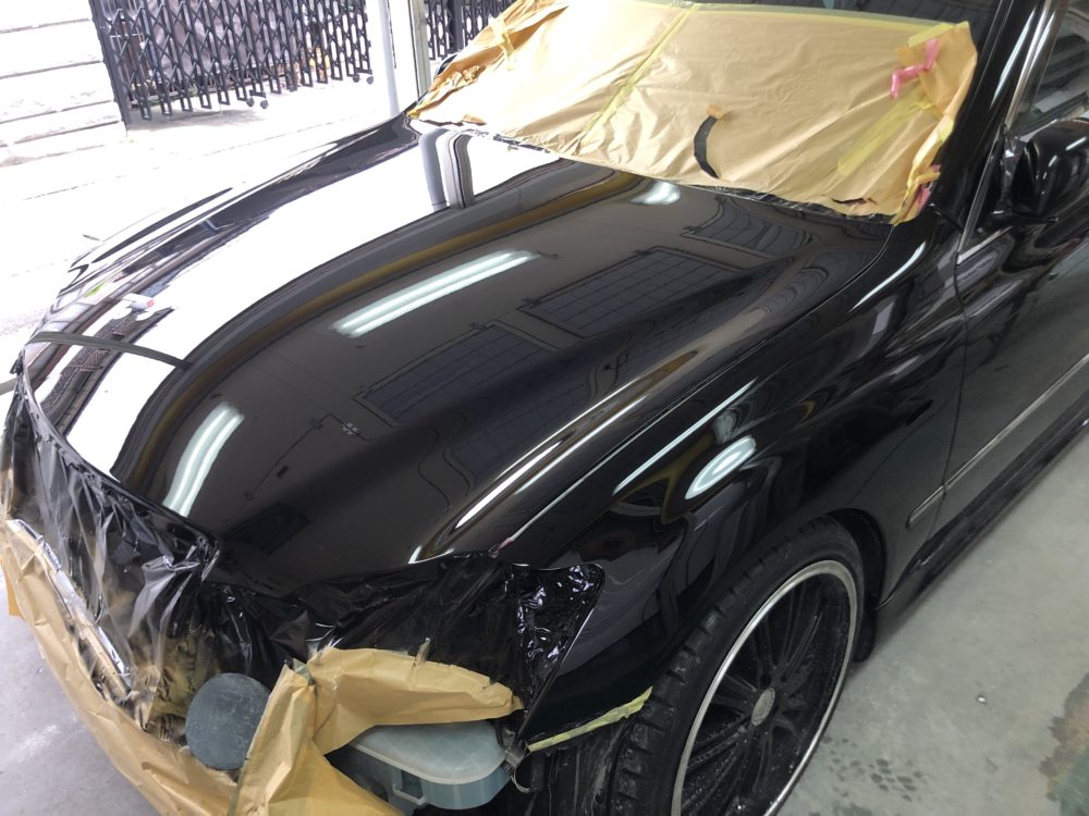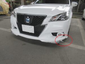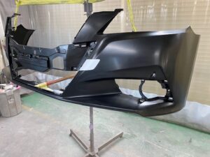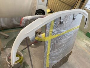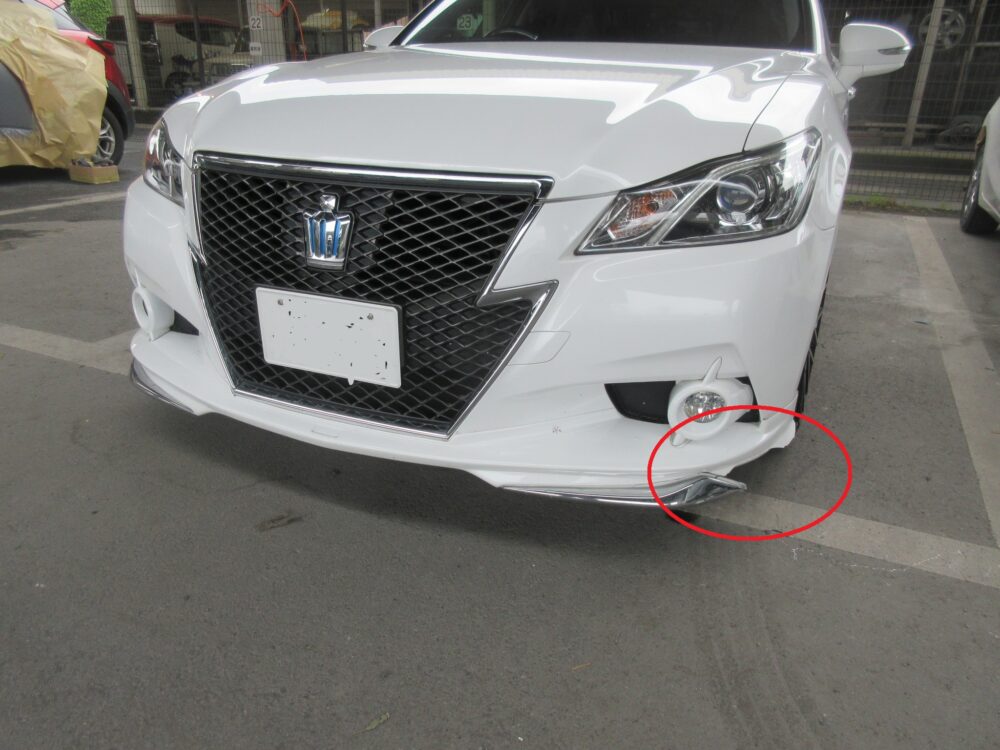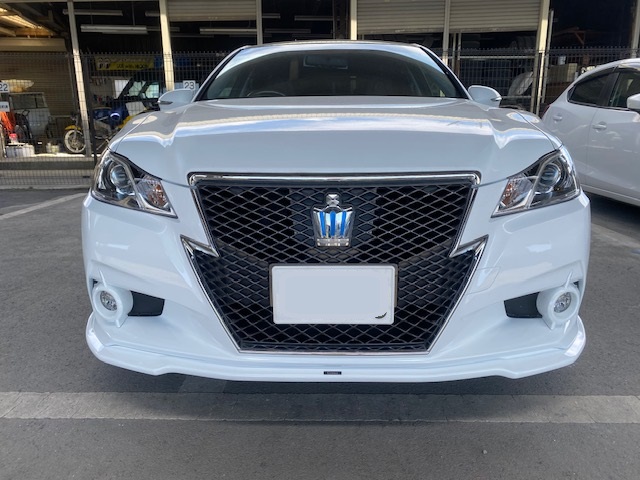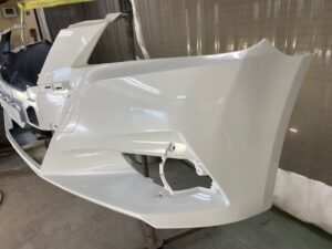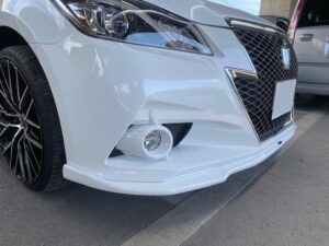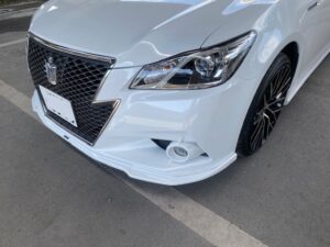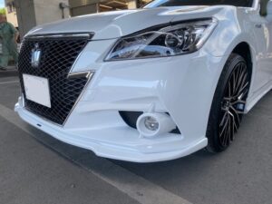 今回はクラウンのフロントバンパー、スポイラー交換をアップします。まずは完成写真です。元々の作業内容はスポイラーが折れてしまったので、今ついているものとは違う形のスポイラーに交換という作業でした。新たにつけるスポイラーはバンパーにかぶらず、下側に付くタイプのスポイラーなので穴が丸見え。。なのでバンパーも新品に交換!ということになりました。このクラウンはボディカラーもクラウンのパールホワイトではなく、レクサスのパールホワイトに塗り替えられているのでFRPスポイラーは巣穴がボコボコあるので薄くパテを入れて巣穴を埋めていきます。パテを研ぎサフェーサーを塗ります。それでも埋まりきれていない巣穴を埋めます。そうしてやっと塗装です。塗りあがり👍