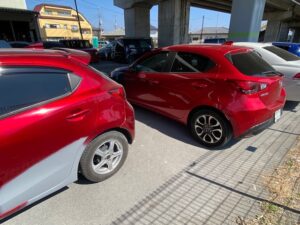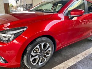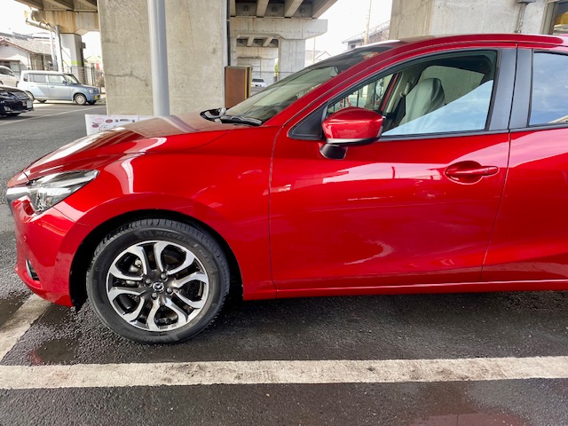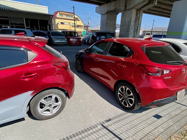 明日は定休日です🎈今週ありがとうございました😁今回もデミオです。まずは完成写真。前回のデミオはカラーコード46Vという赤でしたが、今回は41Vという赤です。どちらも匠塗といわれる難易度高めの色です。並べるとこんな感じ。