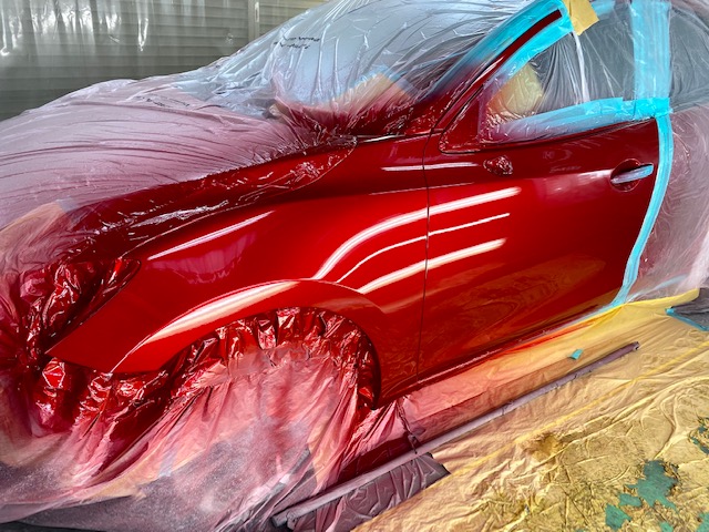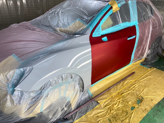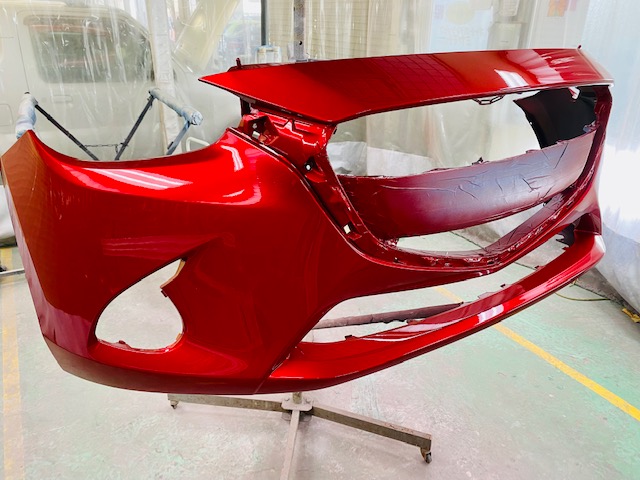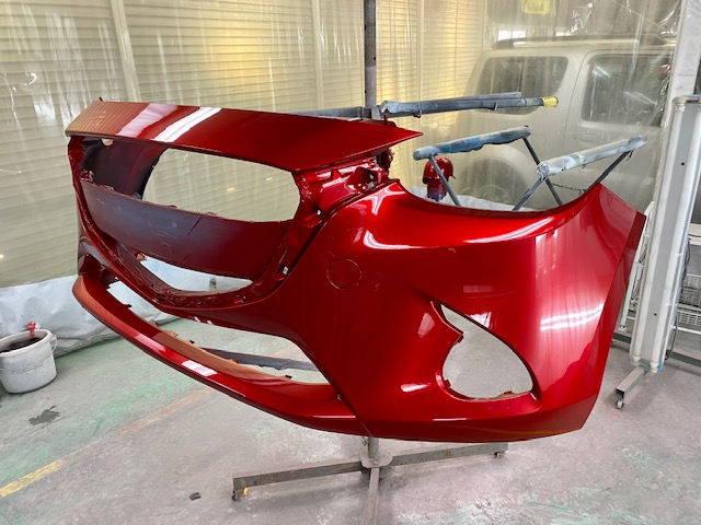 今回はデミオの前回り修理をアップします。こちらのお車です。ボンネット、左右フェンダー、バンパー、ヘッドライトなど交換です。先に裏を塗ってから組み付け。バンパーは車種や色によっては塗装済みの物もあるのですが、今回は未塗装の新品バンパーなので塗装します。塗ってはいけない部分をしっかりマスキングで隠してから塗ります。続いてボディです。ボディのパネルは塗装済みの物は無いので、交換時には必ず塗装の作業が入ります。磨いて組んで完成です。******************〒326-0338 栃木県足利市福居町1261-1AUTO BODY SHOP MIYAMOTOTEL 0284-72-5380FAX 0284-72-5385e-mailHP営業時間 AM9時~PM5時(定休日 日曜、祝日)インスタグラムフェイスブック****************** -