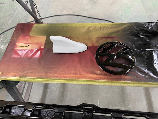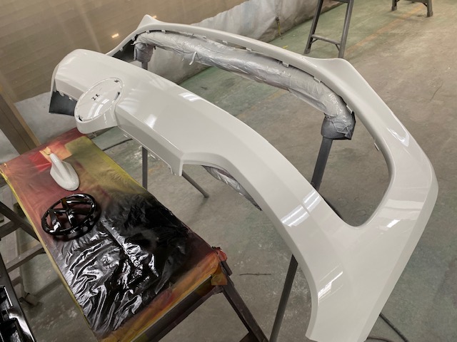 明日は定休日です。よろしくお願いします。今回はオートバイをアップします。スズキ カタナの部分補修です。バイクを倒してしまったそうで、タンクのへこみ、カウルの割れの修理です。チラっと完成写真を色はパールホワイトです。ビフォー撮り忘れたので、途中から。カウルも割れをくっつけてパテで形を整えていきます。サフェーサー一回目。傷のついていない右側のロゴも過去に塗装されたときのマスキングがガタガタなので、塗り直します👍サフェーサー二回目。マスキングをして塗装します。バイクはカラーコードがないので、現物合わせで色を作っていきます。まずはパールホワイト塗りあがり。リアカウルはこれで完成👍タンクに文字を塗装していきます。もちろん文字にも色を合わせていちから作ります。マスキングを剥がして全体にクリヤー。カウルは黒の部分を塗装完成です!スズキのロゴもスッキリと👍カウルもばっちり👍 -